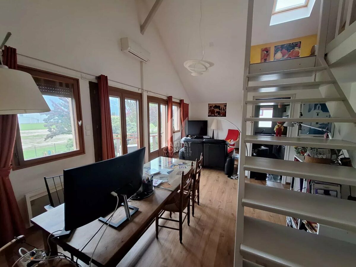 Le second dispose d’une cuisine indépendante, salle de bain avec baignoire, cellier, placard, une belle salle à manger ouverte sur un balcon, ainsi qu’une mezzanine idéale pour créer une chambre ou un espace bureau